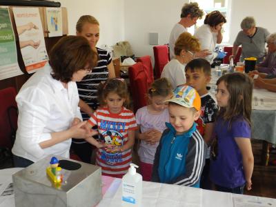 Nagy érdeklődés vette körül – az óvodából érkezettek legnagyobb örömére – a fluoreszkáló oldattal végzett kézmosási technikát bemutató higiénés szakembert, aki UV lámpa segítségével világított rá, hogyan kell helyesen megmosni a kezünket, mielőtt asztalhoz ülünk étkezni vagy bármi tevékenységet végzünk.